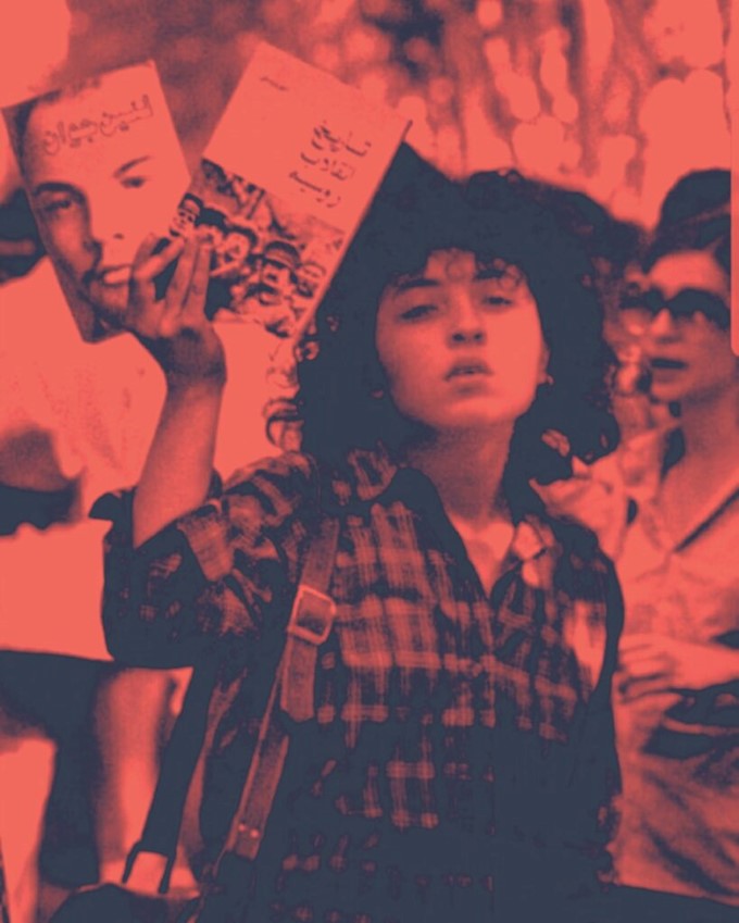Une jeune communiste iranienne tenant deux livres sur la révolution russe entre ses mains, l’un intitulé « Histoire de la révolution russe » et l’autre intitulé « Jeune Lénine », Téhéran, 1979. Par un photographe inconnu.