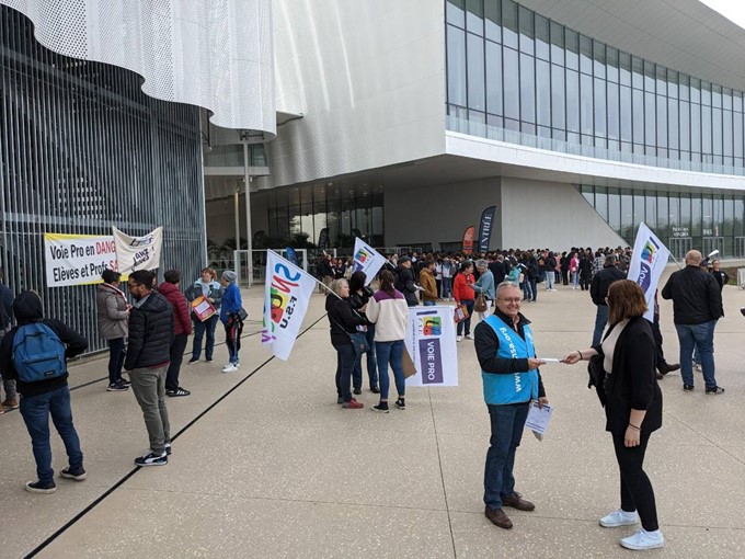 Devant CO’Met, où se tient ce mardi 18 octobre un salon pour l’emploi des jeunes, quelques dizaines de représentants de l’enseignement professionnel (SE-Unsa et Snuep-FSU) distribuent des tracts aux élèves.Ils veulent alerter à propos d’une réforme qui se profile pour la rentrée de septembre 2023.