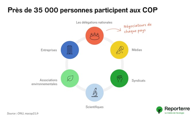 Une foule d’acteurs affluent des quatre coins de la planète pour participer aux COP : environ 35 000 personnes chaque année.