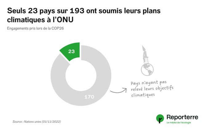 Moins reluisant, alors que les pays avaient jusqu’au 23 septembre 2022 pour prendre des engagements plus forts cette année, en rehaussant leurs objectifs climatiques, seuls une vingtaine de pays ont soumis leurs plans climatiques à l’ONU jusqu’à présent.