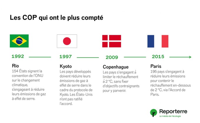 Les COP se succèdent, et certaines aboutissent à des avancées (comme le Protocole de Kyoto en 1997, l’Accord de Copenhague en 2009 et l’Accord de Paris en 2015), d’autres sont décevantes.