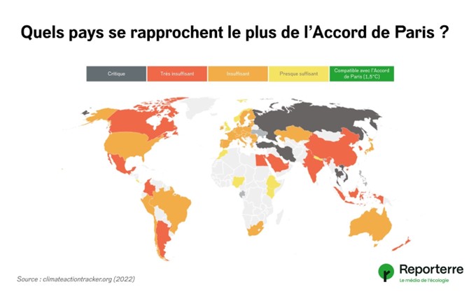 Les plus mauvais élèves : la Russie, l’Iran, la Turquie. À l’inverse, quelques pays sont sur des trajectoires « presque suffisantes », selon le Climate Action Tracker, tels le Maroc, la Norvège, le Kenya… Les politiques mises en place dans l’Union européenne sont également jugées insuffisantes par rapport aux objectifs climatiques.