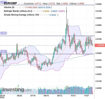 Du point de vue de l’analyse technique, l’euro (EUR/GBP) se trouve actuellement dans une posture indécise, évoluant entre la résistance de 0,8812-0,8831 livre Sterling et le support de 0,8565-0,8576 livre Sterling (des seuils techniques qui se confondent actuellement avec les bandes de Bollinger, jauge de la volatilité des cours).