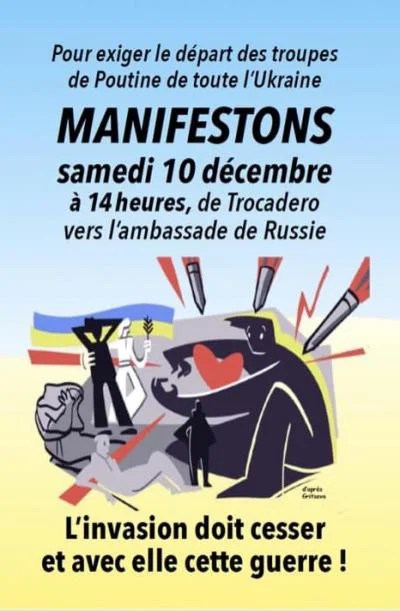 L’invasion doit cesser et avec elle cette guerre ! Voilà pourquoi nous manifestons et vous appelons à manifester samedi 10 décembre 2022 à 14 heures pour exiger le départ des troupes de Poutine de tout le territoire de l’Ukraine !