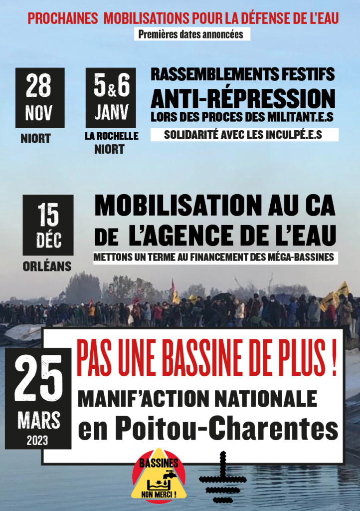 Dans les prochaines semaines, Bassines Non Merci continuera à interpeller les élu.es pour arrêter ces projets d’accaparement de l’eau, notamment ceux qui ont le pouvoir d’autoriser le financement ou non des bassines. Nous nous rassemblerons le 15 décembre à Orléans à l’Agence de l’Eau Loire Bretagne lors de la séance plénière de son CA. C’est une date clef à laquelle pourrait être validé le financement public – à hauteur de plusieurs dizaines de millions d’euros – des projets de bassines de la Vienne et les compléments de financement de celles des Deux-sèvres. Le budget initialement prévu n’étant pas suffisant pour soutenir le gouffre financier que représentent les 16 bassines du projet en cours sur ce département .