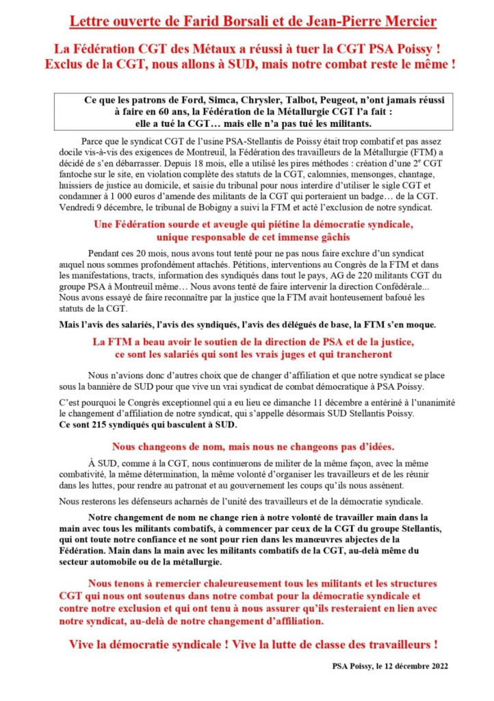 Je vous transmets, ci-joint, les deux tracts diffusés à l’usine hier et aujourd’hui pour rendre compte de leur congrès, un tract siglé donc SUD et un autre sous forme de « Lettre ouverte de Mercier et Borsali » où ils redisent leur démarche et l’attitude général. Ils tiennent à souligner le soutien qu’ils ont dans la CGT du groupe contre la Fédé, et l’espoir (mais ce n’est jamais facile) qu’ils pourront, par-dessus la tête de la fédé CGT, continuer à bosser avec les militants et syndicats CGT des autres usines, qui les ont jusque là soutenu contre la fédé. C’est là-dessus qu’ils concluent ce tract (lettre ouverte) diffusé à l’usine. Vous verrez.