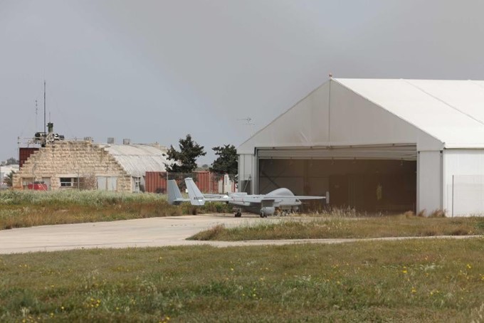 Le drone utilisé par l’agence européenne Frontex pour effectuer une surveillance aérienne de la partie centrale de la mer Méditerranée, garé devant un hangar à l’aéroport international de Malte. © 2022 Border Forensics