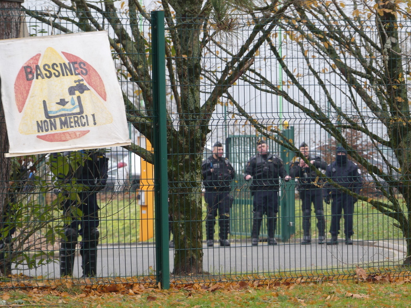 Une quinzaine d’agents des forces de police et des renseignements généraux forment une ligne à l’entrée de l’Agence de l’eau Loire-Bretagne en milieu de journée jeudi 15 décembre. Séparés par une grille, plus de 200 activistes antibassines entament des chants — « No basaran ! » —, montent un « banquet paysan », et déroulent des banderoles — « Pensées par nos parents, les mégabassines assoiffent nos enfants ». Un homme porte une veste kaki siglée « écoterroriste » : un clin d’œil aux mots du ministre de l’Intérieur Gérald Darmanin. Les manifestants accompagnent un groupe d’élus et de militants que l’agence a accepté de recevoir. C’est elle qui décide d’accorder, ou non, les subventions publiques à ces retenues d’eau géantes dédiées à l’agroindustrie en chantier dans une trentaine de départements. La requête des écologistes est simple : un « moratoire citoyen » et l’arrêt de ces subventions : « pas un centime de plus pour les mégabassines ».