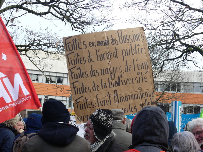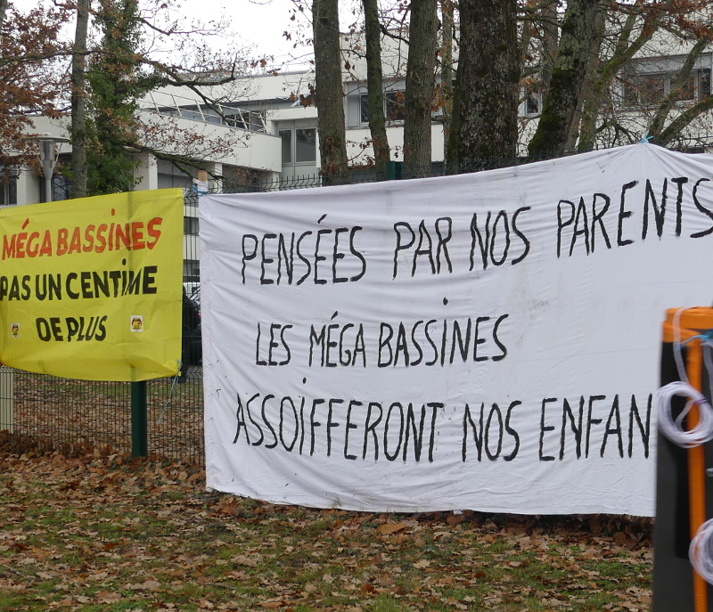 Après la mobilisation de Sainte-Soline le 29 octobre, le mouvement anti-bassines entend poursuivre le combat. Notamment en « s’invitant », comme ce jeudi, dans les débats de l’Agence de l’eau et en pesant sur celle-ci afin qu’elle « mette un terme au financement public de ces projets délétères ». Dans les prochains mois, l’Agence de l’eau Loire-Bretagne doit en effet se positionner sur le financement de méga-bassines en projet dans le Poitou (trente nouveaux projets ont été annoncés dans la Vienne). »