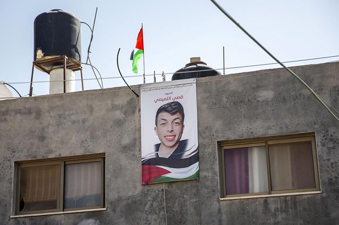 Un poster avec la photo de Qusai Tammi, un jeune étudiant palestinien de 19 ans, tué la nuit du 24 octobre 2022 par des tirs provenant d’une tour militaire israélienne, accroché sur la façade de sa maison dans le village de Nabi Saleh, en Cisjordanie.