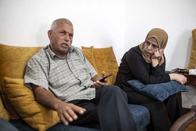 Mahmoud Tamami, le père du jeune Palestinien tué au bas de la tour israélienne, avec son épouse Sahar, répond aux questions des enquêteurs d’Al-Haq.