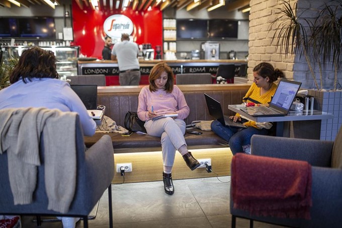 Tahreer Jaber, la directrice exécutive de l’organisation féministe Union of Palestinian Women’s Committees (UPWC) et une partie de son équipe travaillent dans un café à Ramallah, leurs bureaux ayant été fermés par l’armée israélienne.