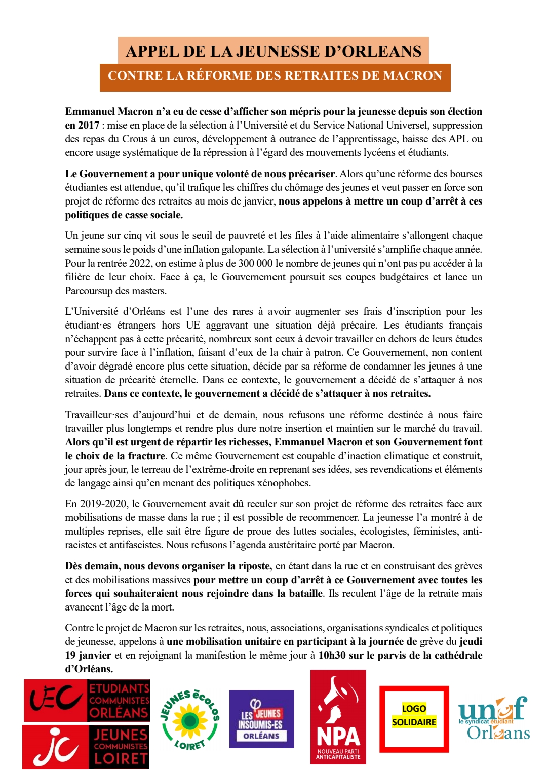 MANIFESTATIONS :ORLEANS : 10h30, parvis de la Cathédrale MONTARGIS : 10h30, place du Pâtis GIEN : 10h, place Jean Jaurès PITHIVIERS : 10h30, devant la sous-préfecture BEAUGENCY : 10h30, parking des Chaussées, avenue des Chaussées