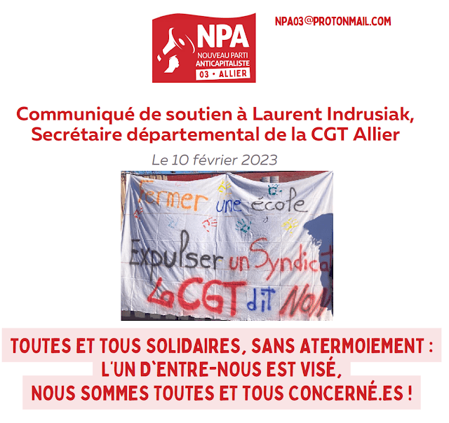 Le NPA Allier, s’allie à toutes les actions et mesures que Laurent Indrusiak et la CGT jugeront nécessaire de prendre. Il nous faut, avec toutes nos forces, combattre la criminalisation et la répression du mouvement social, des actions syndicales, de nos actes de résistance par l’ordre libéral et réactionnaire.