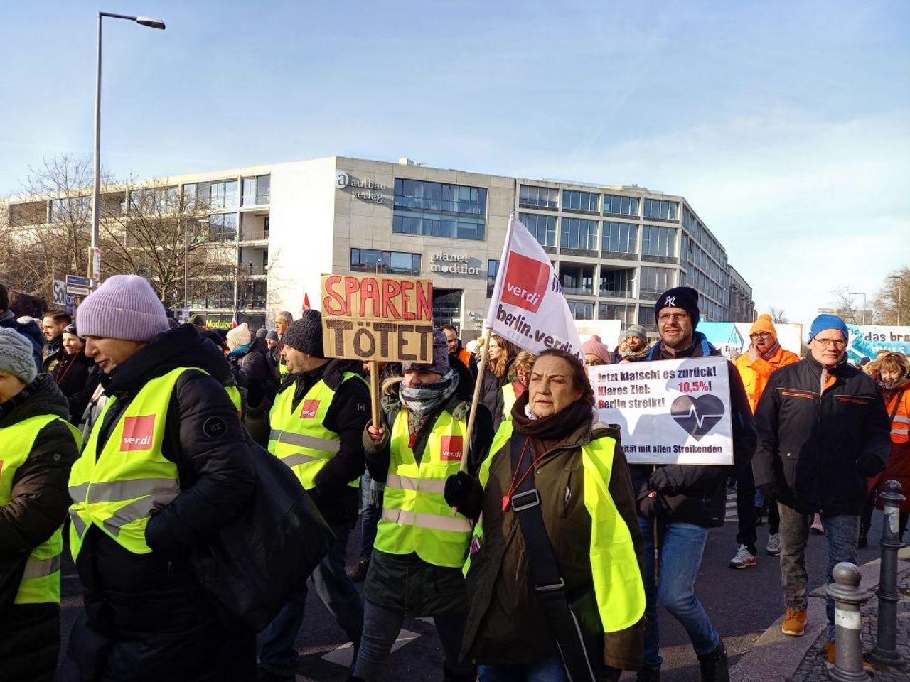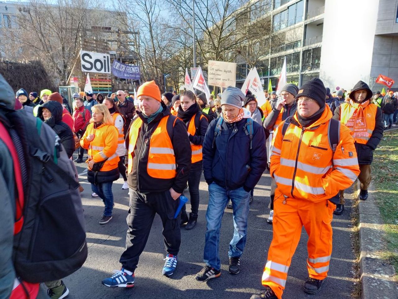 À Berlin, plus de 2.000 employés se sont rassemblés jeudi matin pour le rassemblement central près de la Chambre des représentants. Il s’agissait principalement des éboueurs du service de nettoyage de la ville (BSR), des infirmières des hôpitaux, Charité et Vivantes, ainsi que des employés de la compagnie des eaux de Berlin. Les employés du BSR ont manifesté en tenue de travail orange, notamment parce que le conseil d’administration du BSR avait voulu leur interdire de faire grève dans cette tenue.