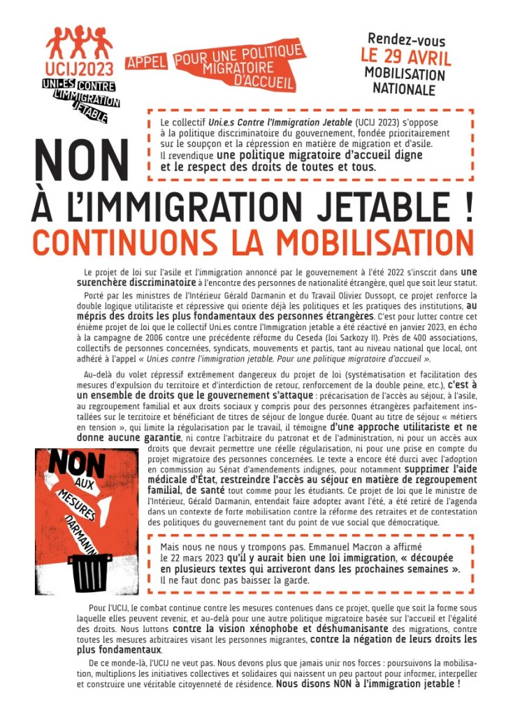 Porté par les ministres de l’Intérieur Gérald Darmanin et du Travail Olivier Dussopt, ce projet renforce la double logique utilitariste et répressive qui oriente déjà les politiques et les pratiques des institutions, au mépris des droits les plus fondamentaux des personnes étrangères. C’est pour lutter contre cet énième projet de loi que le collectif « Uni.es contre l’Immigration jetable » a été réactivé en janvier 2023, en écho à la campagne de 2006 contre une précédente réforme du Ceseda (loi Sarkozy II). Près de 400 associations, collectifs de personnes concernées, syndicats, mouvements et partis, tant au niveau national que local, ont adhéré à l’appel « Uni.es contre l’immigration jetable. Pour une politique migratoire d’accueil ».