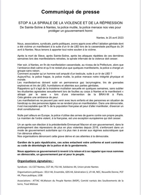 Le député de Loire-Atlantique, Andy Kerbat, avait publié sur Twitter un communiqué, faisant part de son indignation et disant que « le maintien de l’ordre violent à la française est une exception européenne qui doit cesser ».