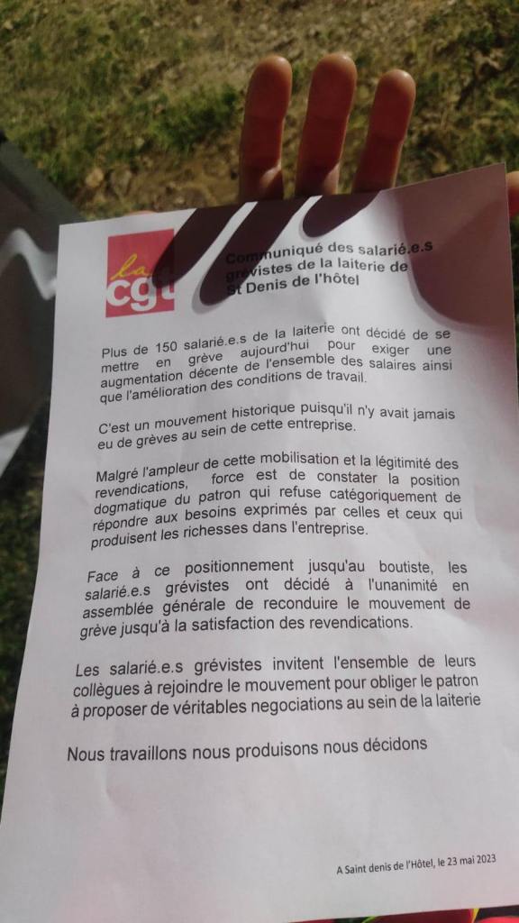 Le NPA est venu apporter son soutien à la jeune section CGT de la laiterie de Saint-Denis-de-l’Hôtel, une section CGT très déterminée et qui tient avec panache un piquet de grève depuis le mardi 23 mai.