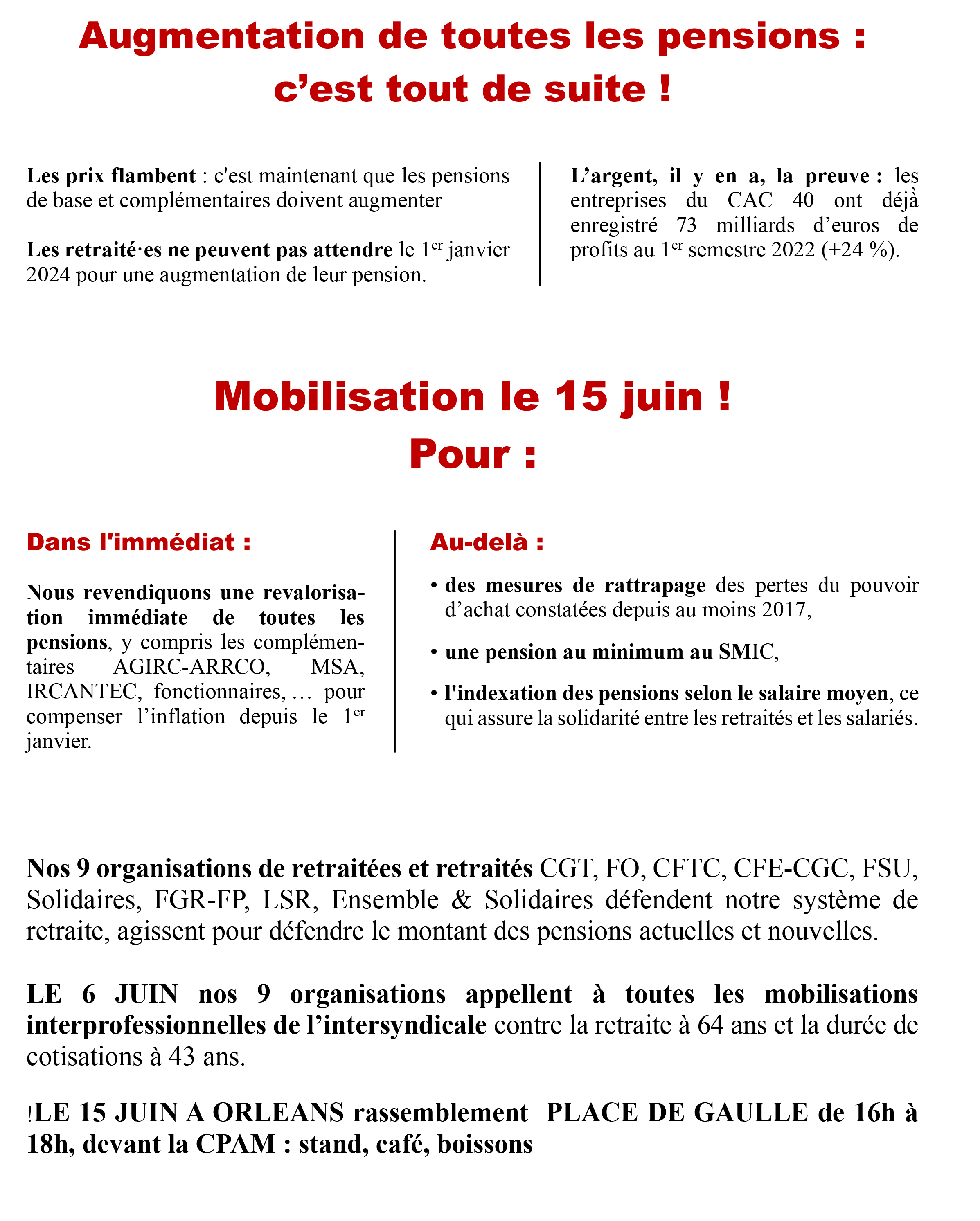 2 rassemblements sont prévus dans le département:Montargis: 10h30 devant la Sous-PréfectureOrléans: Place de Gaulle, parvis de la CRAM de 16h à 18h: distribution de tracts et gâteux/boissons.