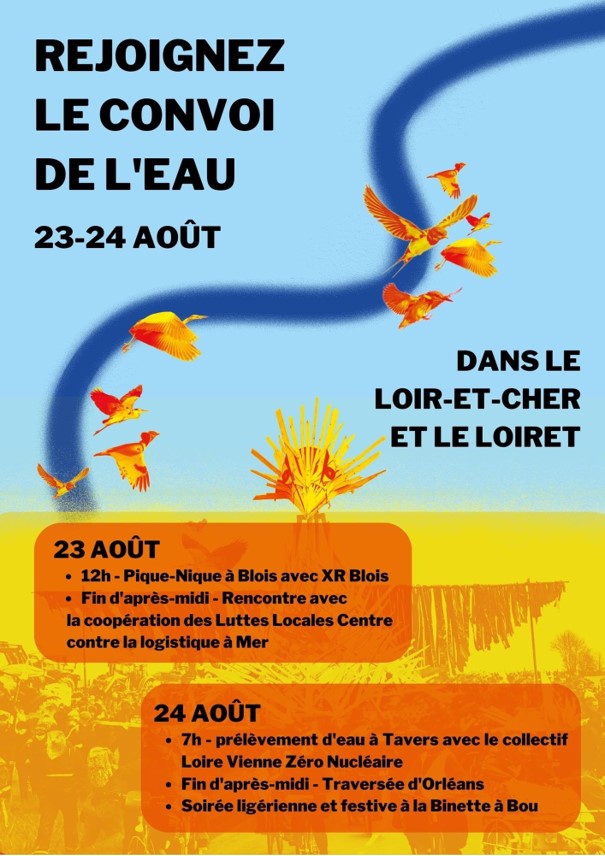 > Mercredi 23 août (Blois, Mer, Lestiou, Loir-et-Cher). « Le convoi partira le matin de Tours et arrivera vers midi à Blois pour un pique-nique » où il sera question des « enjeux de la Loire ».