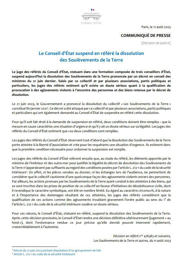 « Une erreur manifeste », répond le Conseil d’État, qui parle des Soulèvements comme « d’un courant de pensée », en accord avec les revendications du collectif. Un conglomérat composite réunissant associations, syndicats et partis politiques, dépourvu de dirigeants et de membres identifiés, mais largement soutenu au sein de la société civile.