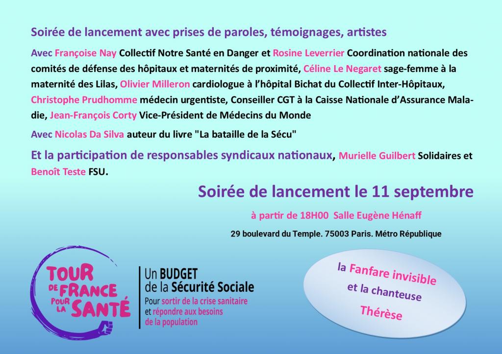 Déroulé : intro de présentation de l’initiative, témoignages (proposés C Prudhomme sur la situation des Urgences (a confirmé sa participation), O Milleron sur fermeture de lits hospitaliers et bataille Hôpital Nord à Paris, Médecins du monde sur AME, maternité CIVG Les Lilas, accès aux soins et mesures gouvernementales…), intervention Nicolas Da Silva sur la Sécu, intervention de responsables syndicaux nationaux (contacts en cours, FSU, Solidaires, CGT). Intermède musical, une artiste a répondu positivement, un autre en attente.