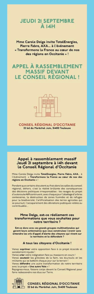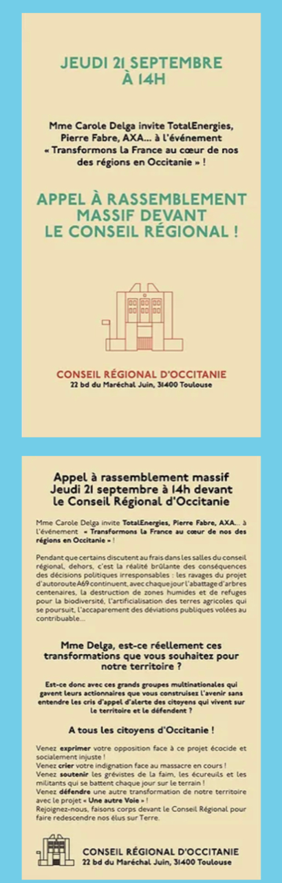 Après avoir proposé la date du 21 septembre pour un rendez-vous avec les opposants, Carole Delga semble avoir changé d’avis. Au même moment, le conseil régional accueillera plutôt le colloque « Transformons la France » en présence des plus gros pollueurs tels que TotalÉnergies et Axa (connu pour ses investissements dans les énergies fossiles).