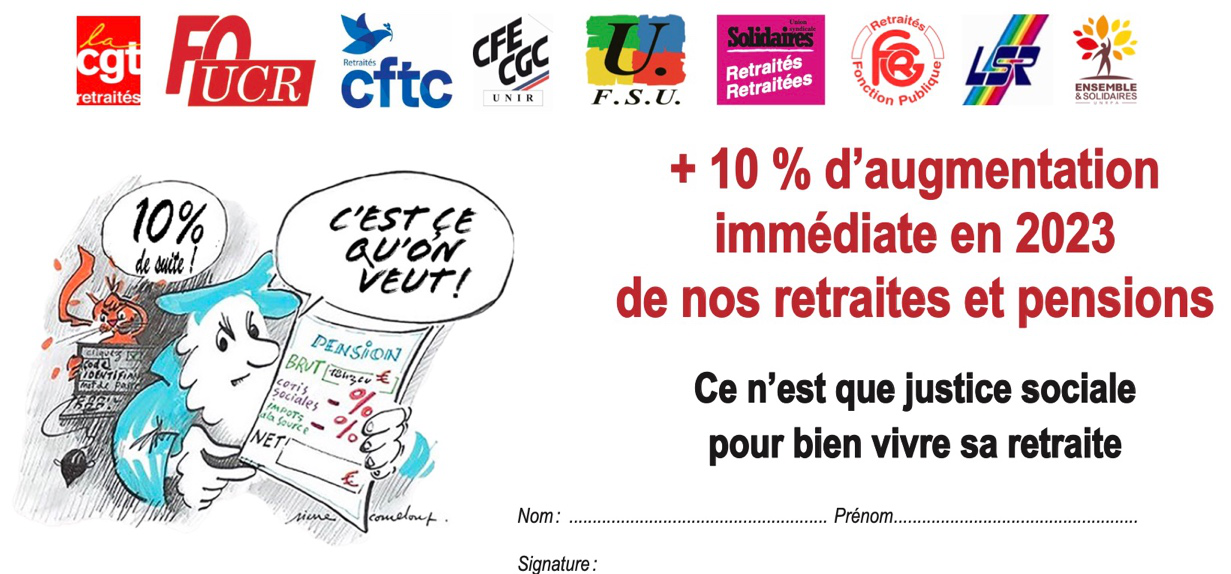 Les 9 organisations de retraité·e·s revendiquent une augmentation immédiate de 10 % des pensions, à valoir sur un véritable rattrapage du pouvoir d’achat, la compensation des pertes subies et appellent à intensifier la signature de la pétition https://chng.it/DWNh5nnd88