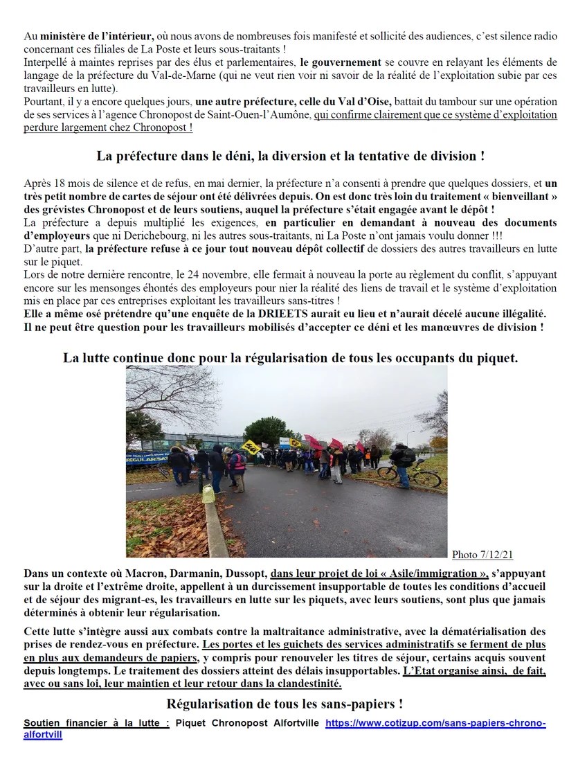 TRAVAILLEURS SANS-PAPIERS DU PIQUET CHRONOPOST ALFORTVILLE : DEUX ANS DE LUTTE POUR LA RÉGULARISATION ! RASSEMBLEMENT DE SOUTIEN DEVANT LA PRÉFECTURE À CRÉTEIL LE 7 DÉCEMBRE