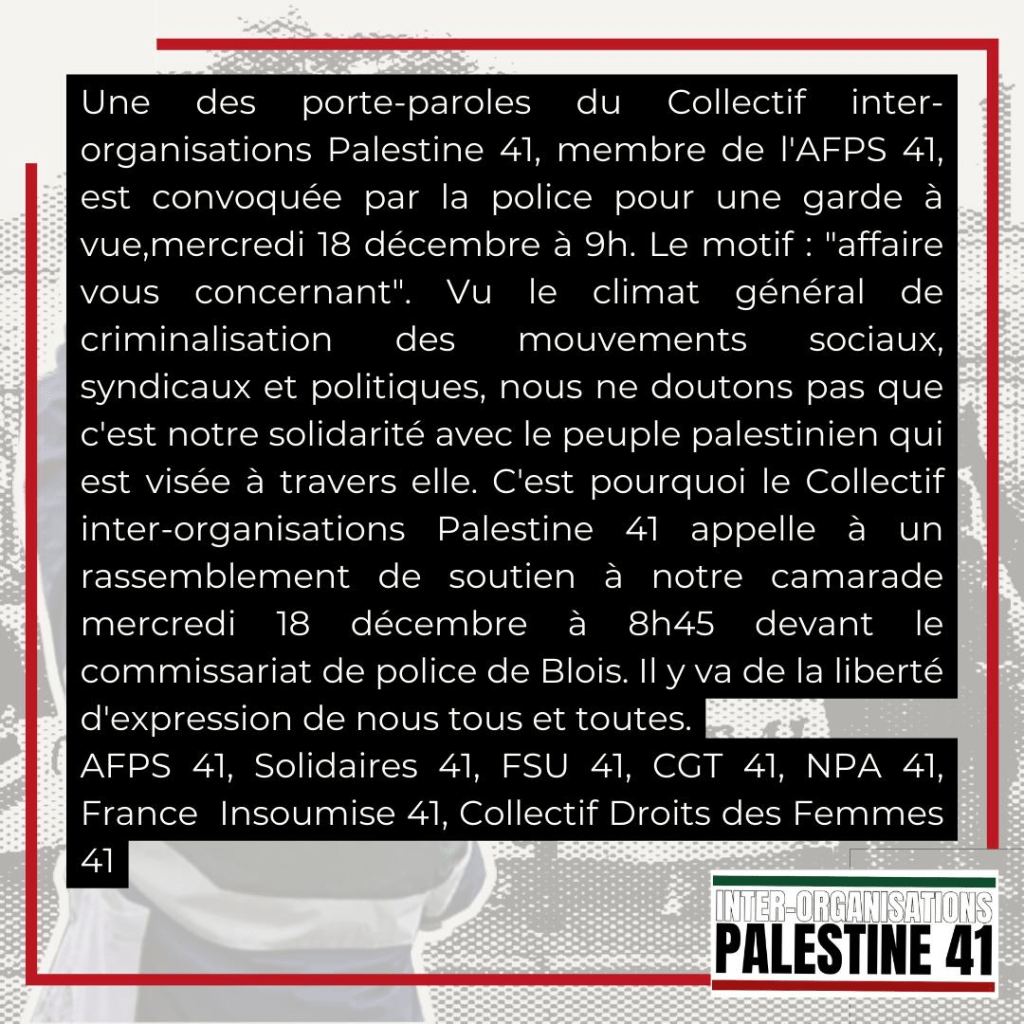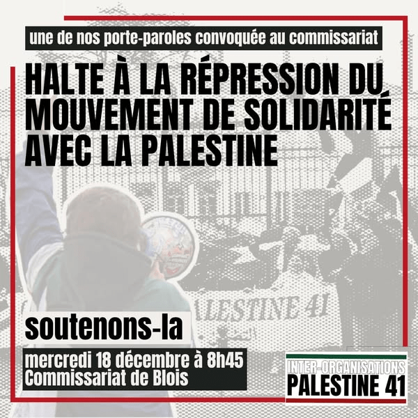 Soyons nombreux·euses ce mercredi devant le commissariat de Blois pour apporter notre soutien à notre camarade porte-parole de l’Inter-Organisations Palestine 41 qui se voit placée en garde-à-vue.