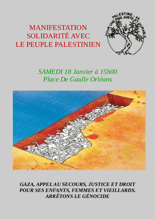 Manifestation pour les droits et la survie du peuple Palestinien Samrdi 18-01-205 à 15h Place De Gaulle à ORLEANS