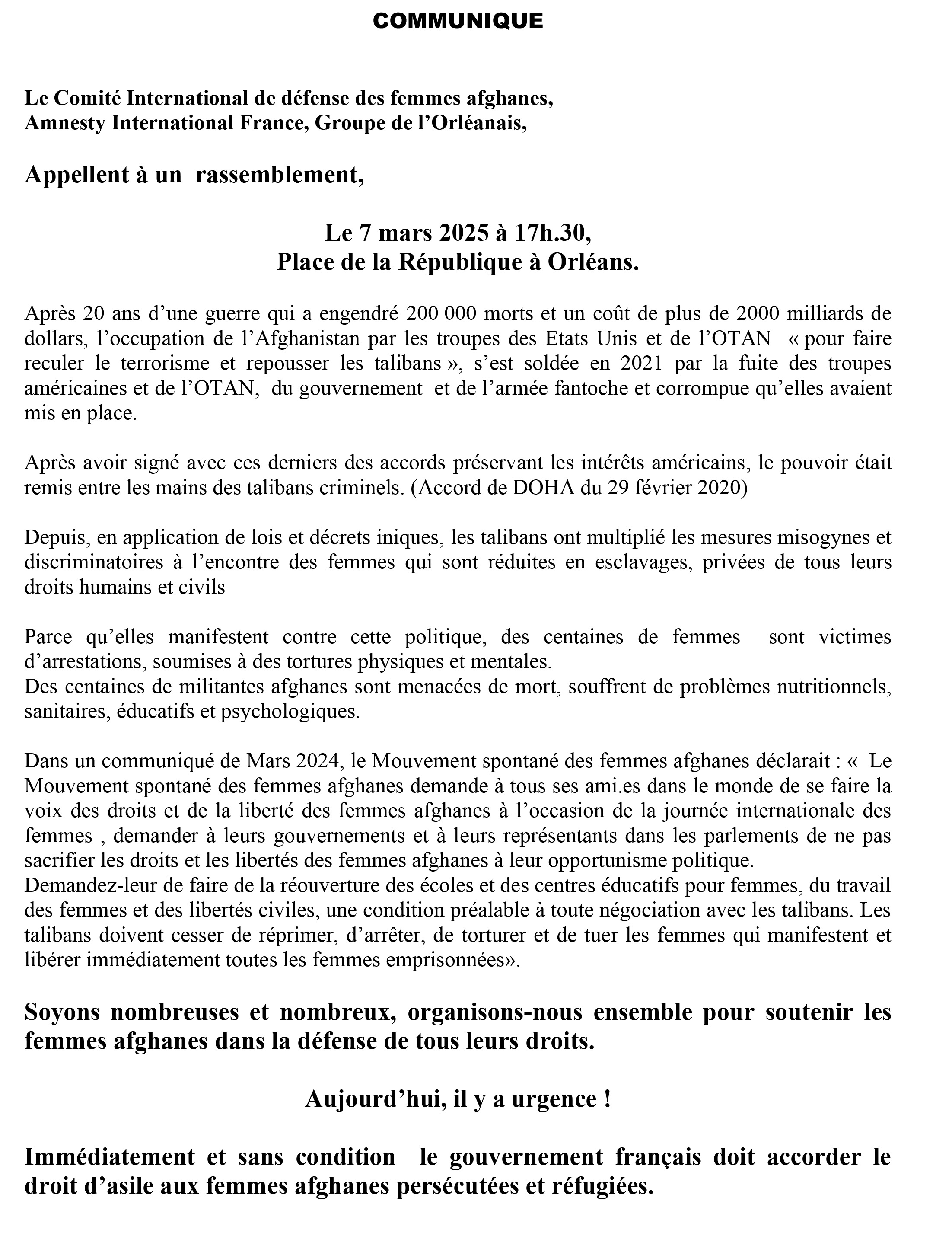 Le Comité International de défense des femmes afghanes s’est associé au Groupe de l’Orléanais d’Amnesty International France pour participer à un rassemblement le 7 mars 2025 à 17h.30 Place de la République à Orléans (voir communiqué joint).