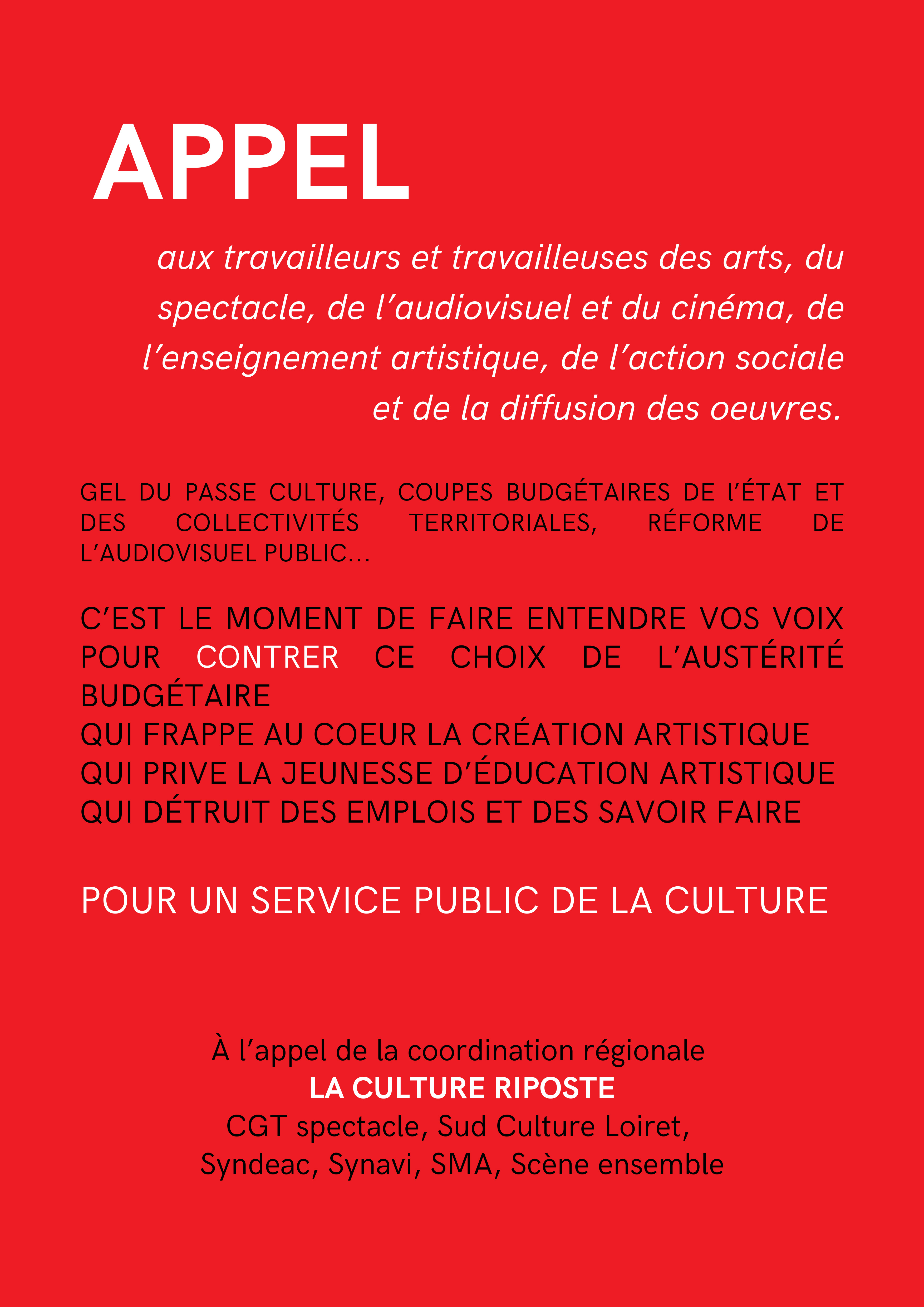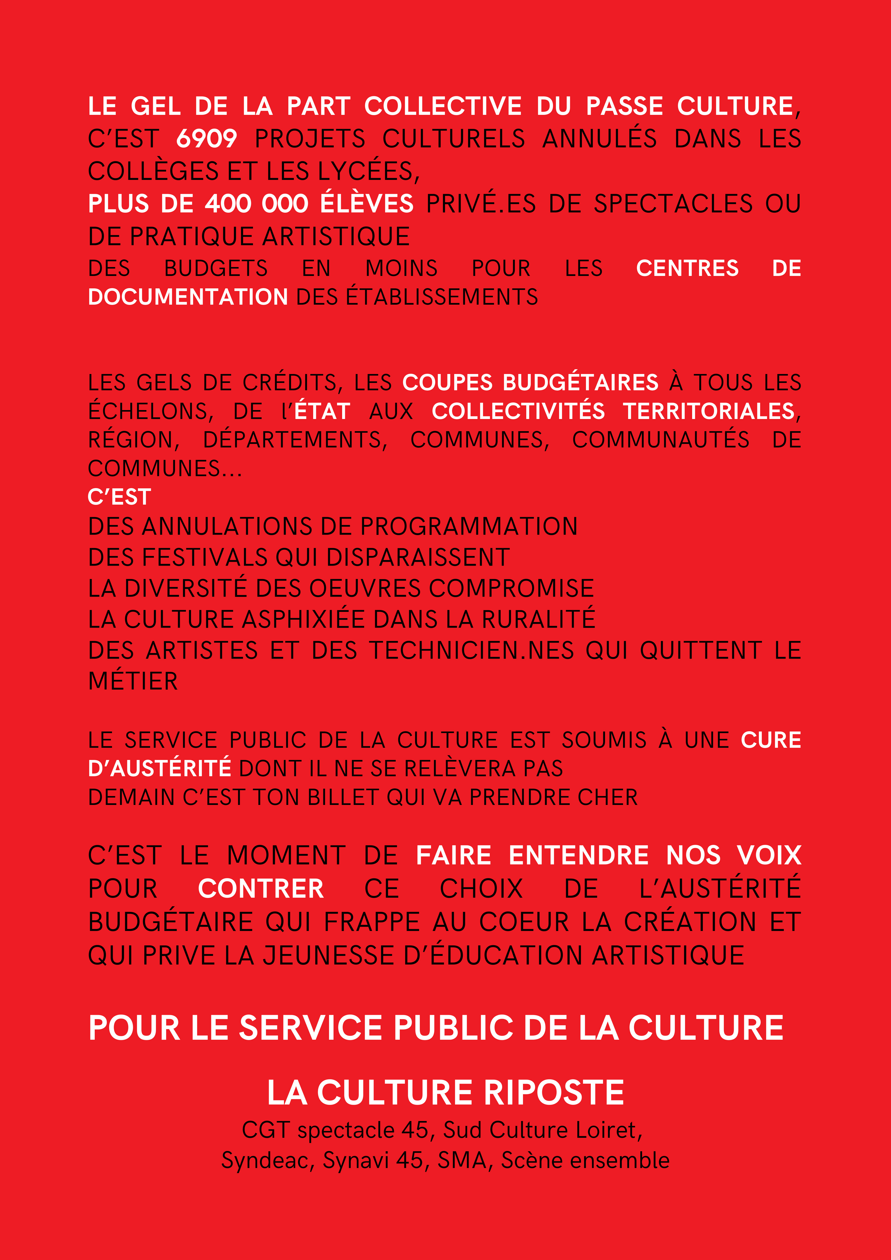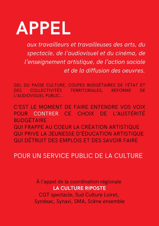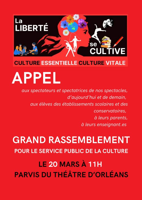 ORLEANS : GRAND RASSEMBLEMENT POUR LE SERVICE PUBLIC DE LA CULTURELE 20 MARS À 11H PARVIS DU THÉÂTRE !