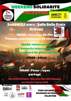 ORLEANS : Soirée de soutien à la Palestine avec la présence d’un responsable d’ANESTY INTERNATIONAL Samedi 22 mars dés 15h !