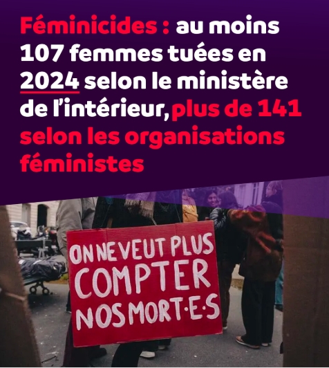 Selon l’Inter Orga Féminicides, qui regroupe plusieurs associations féministes et LGBTQIA + comme Nous Toutes, les Dévalideuses, ou encore Acceptess-T, l’année 2024 a connu 141 féminicides. La différence entre ces deux chiffres s’explique par les méthodes de recensement. L’inter-orga définit les féminicides comme « le meurtre ou suicide forcé d’une femme en raison de son genre, et ce quel que soit son âge ou les circonstances ». Côté ministère de l’Intérieur, on s’intéresse uniquement aux personnes tuées par leur conjoint ou ex-conjoint.