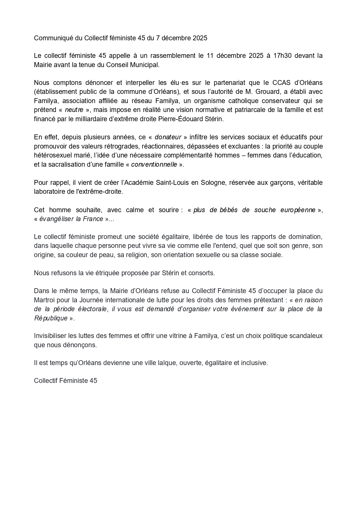 Vous n’êtes pas sans savoir que la ville d’Orléans voit arriver une nouvelle structure « familiale » : Familya Orléans, affiliée au réseau Familya, un organisme catholique conservateur qui se prétend «neutre » mais impose en réalité une vision normative et patriarcale de la famille.