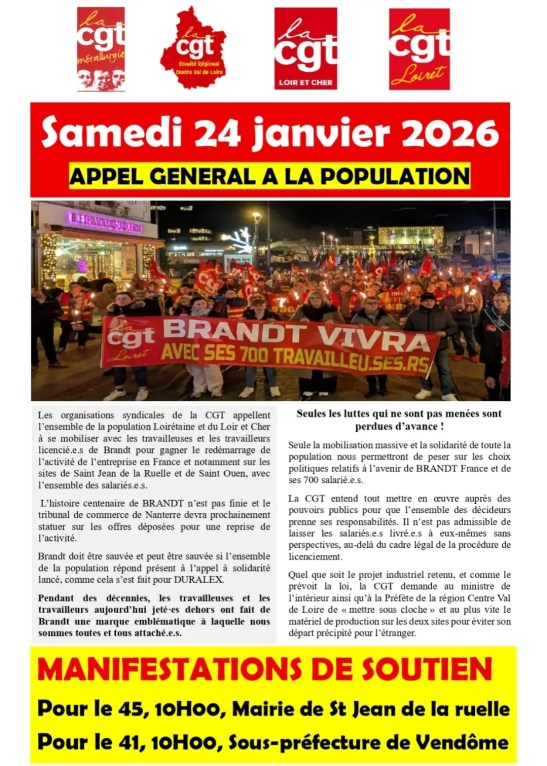 Nous ne pouvons accepter la fermeture de Brandt et appelons à l’interdiction des licenciements. Le NPA du Loir-et-Cher et le NPA du Loiret appellent à rejoindre nos cortèges lors des manifestations qui se tiendront le samedi 24 janvier, à 10h, sous-préfecture de Vendôme, et à 10h, Mairie de Saint-Jean-de-la-Ruelle.
