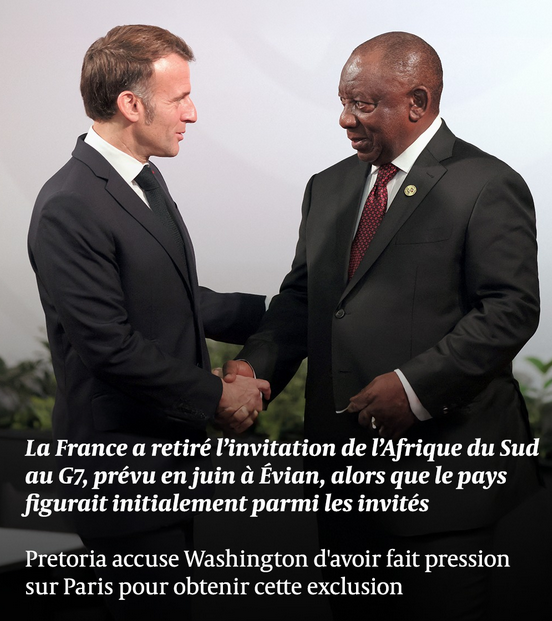 L’Afrique du Sud a été écartée du G7 prévu en juin à Évian, en France, après y avoir été initialement invitée par Macron en personne lors du G20 de novembre 2025.