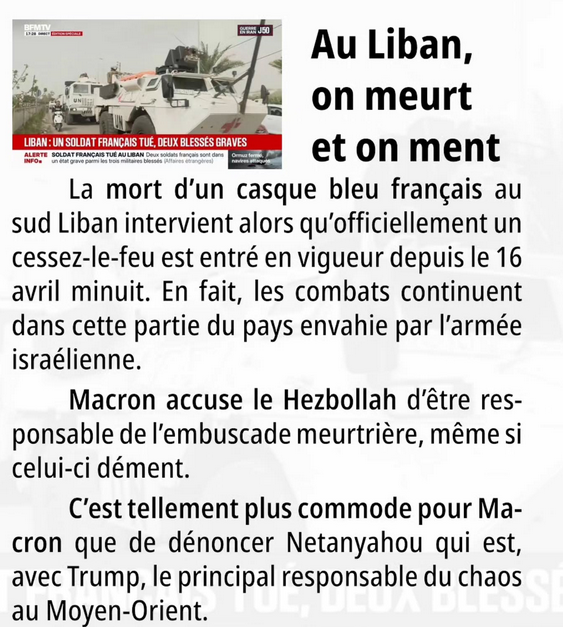 Au delà des péripéties militaires, il semble que l’objectif de Macron, directement ou sous couvert de l’ONU, soit de participer à un « désarmement » du Hezbollah, en collaboration avec le gouvernement libanais, lui-même en pourparlers avec Netanyahou. L’impérialisme français cherche à conserver des positions dans un pays qu’il a toujours considéré comme sa chasse gardée. Non à l’intervention française au Moyen-Orient.